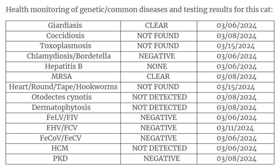 Kali is friendly and gentle with a tick, soft coat and unique golden green eyes. She is a quiet adult female that loves cuddling and loves an attention. Very good mom!